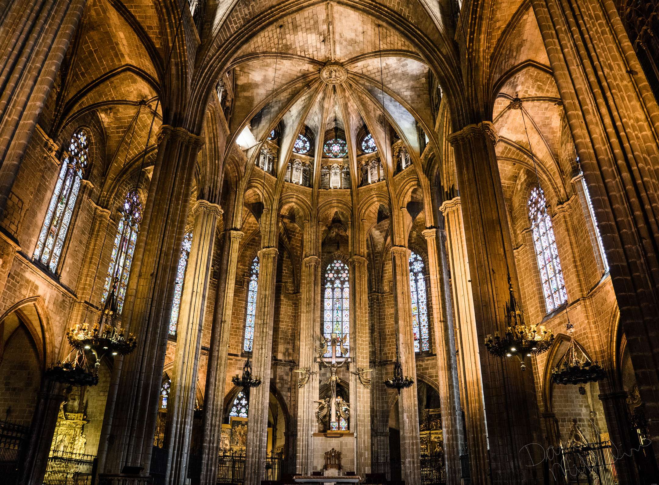 The Chapel of the Holy Sacrament at the interior Cathedral of Barcelona is a small but stunning example of Gothic architecture. It features intricate carvings and stained glass windows that depict scenes from the life of Christ. The chapel is home to the Holy Sacrament, which is kept in a beautiful golden tabernacle at the center of the space.